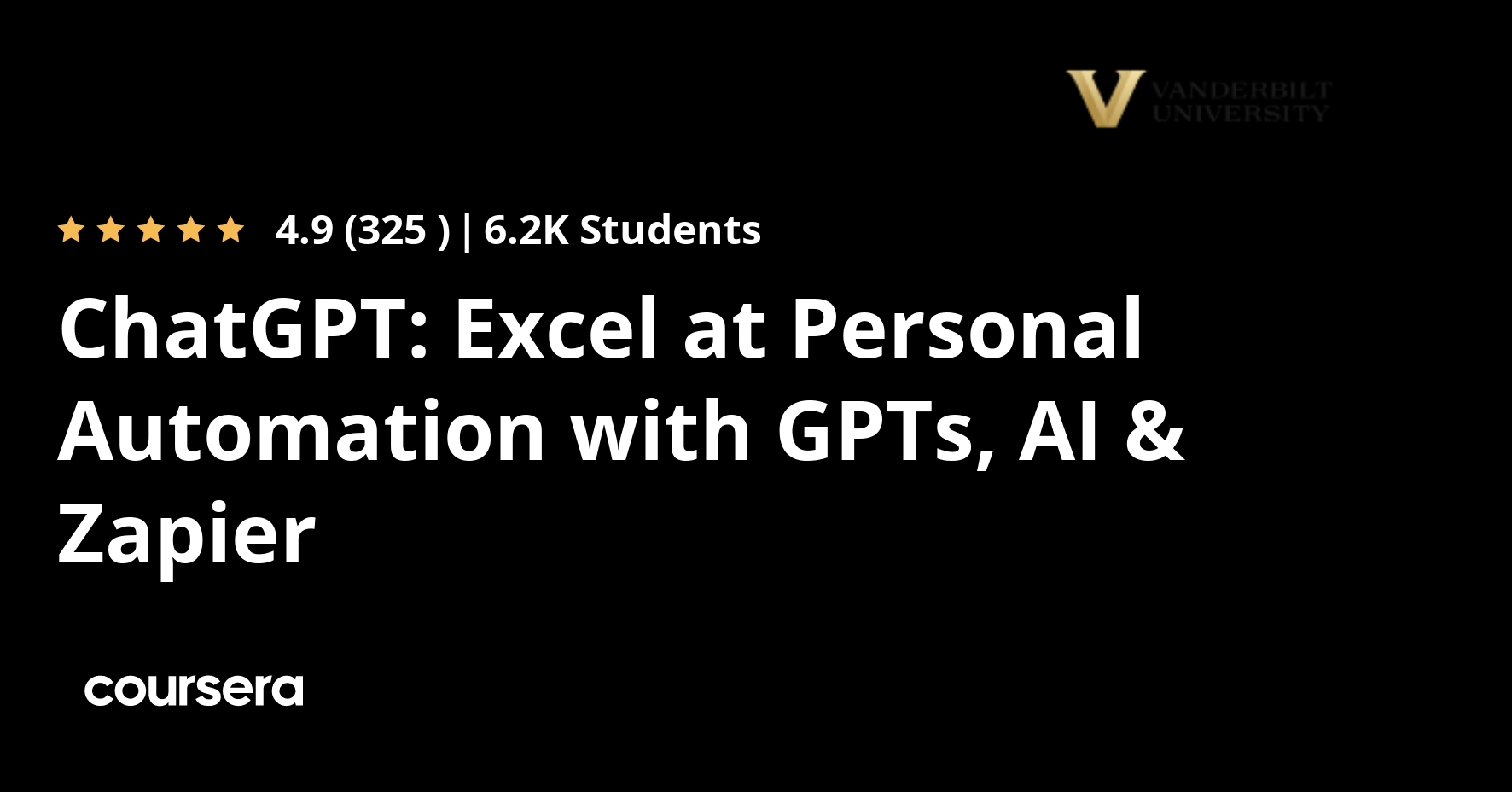 Offered by Vanderbilt University. Master Personal Automation with ChatGPT and Zapier. Learn how to harness ChatGPT, AI tools, GPTs, and … Enroll for free.