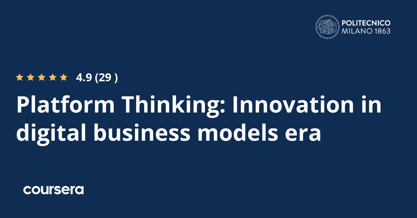 Offered by Politecnico di Milano. Spark Business Transformation through Platforms. Master platform models to foster innovation and exploit … Enroll for free.