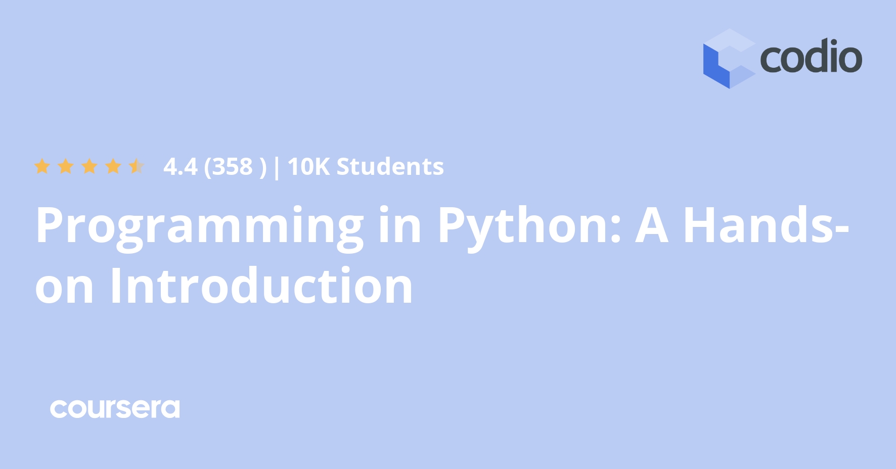 Offered by Codio. Hands-on Introduction to Python Programming. Code and run your first Python program in minutes without installing anything! Enroll for free.